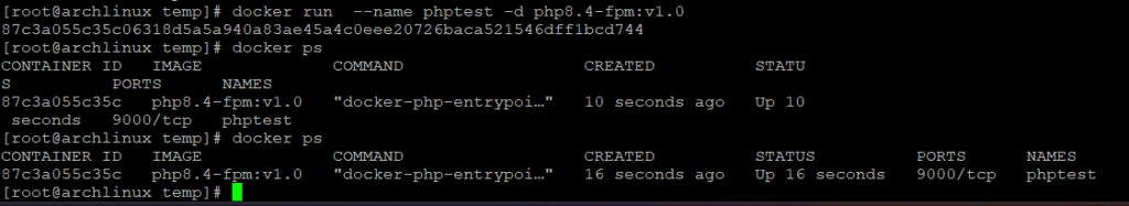 docker run --name phptest -d php8.4-fpm:v1.0