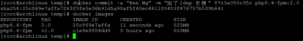 docker commit -a "Ken Ng" -m "加了ldap 支援" 87c3a055c35c php8.4-fpm:2.0